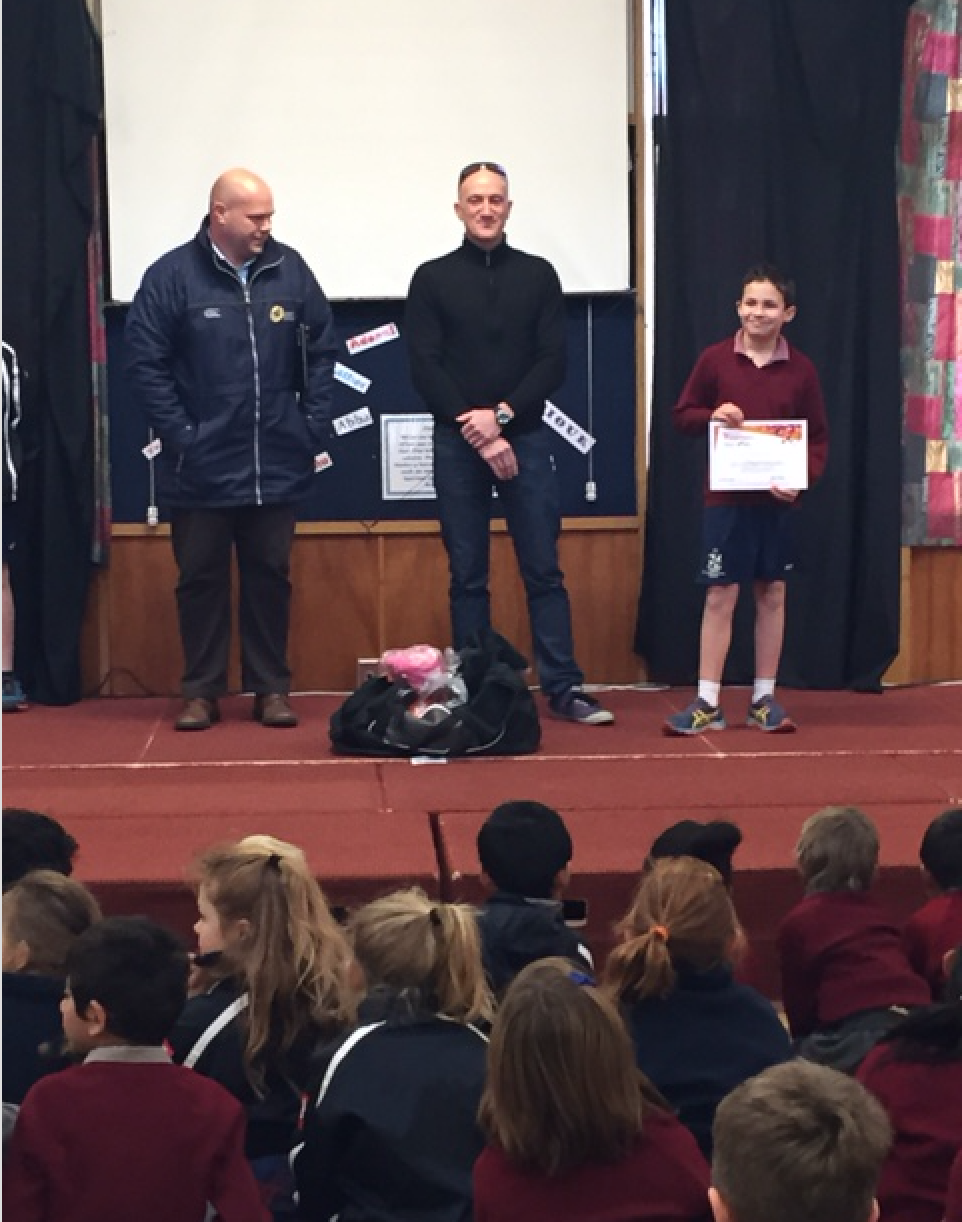 Chris Cant was presented with his prize at school on Monday. Chris has been coaching rugby here for the last seven years and was nominated by Seth Sinclair for a Sport Otago volunteer award. Chris was presented with $500 worth of sporting gear for himself and a $500 voucher for sporting gear for the school. Mrs Souness has already ordered extra balls and equipment for the children to use at lunchtime.